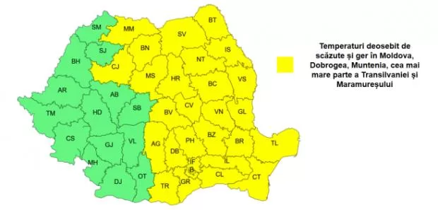 Meteorologii au extins și prelungit codul galben de ger până sâmbătă dimineață, la ora 10.00. Cel mai frig va fi în nordul Moldovei, unde temperaturile vor coborî până la minus 19 grade Celsius.