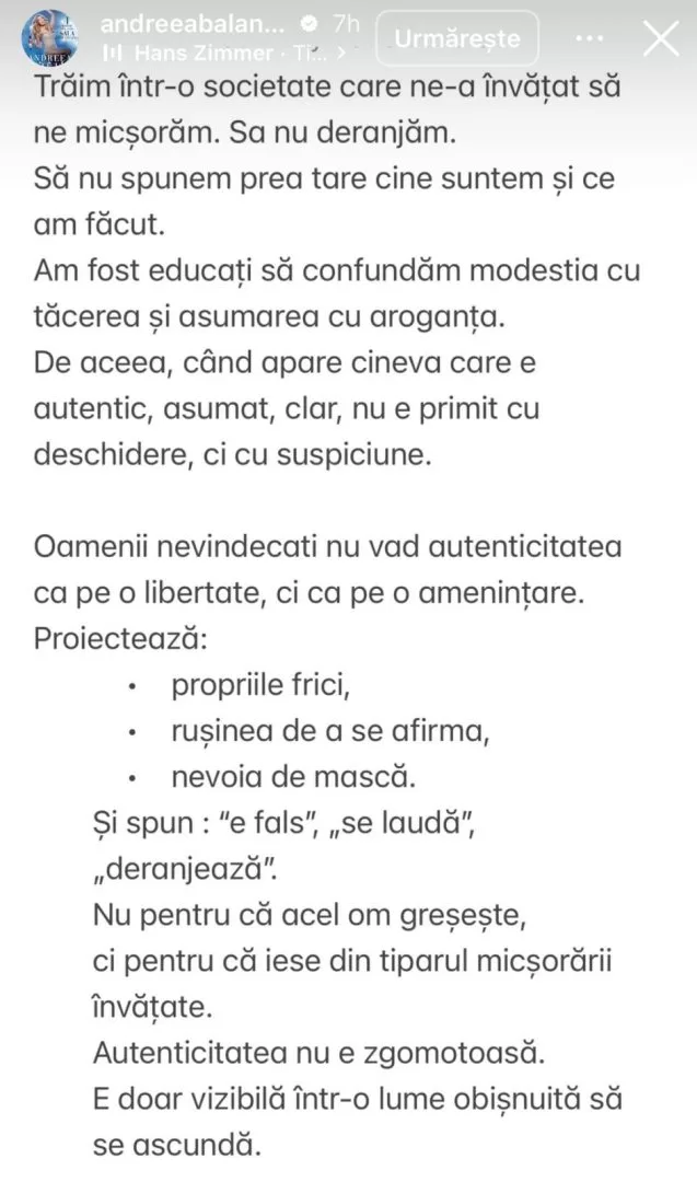 Trăim într-o societate care ne-a învățat să ne micșorăm. Să nu deranjăm. Să nu spunem prea tare cine suntem și ce am făcut”, a scris artista, pe Instagram.